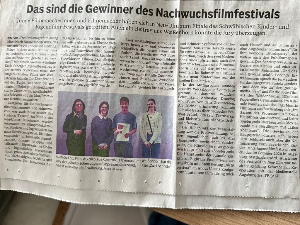 Das Schwäbische Kinder- und Jugendfilmfestival bot auch in diesem Jahr jungen Filmschaffenden aus der Region eine Bühne, um ihre kreativen Arbeiten einem breiten Publikum zu präsentieren. Unter den teilnehmenden Gruppen befand sich auch die Foto- und Film-AG Weißenhorn, die mit ihrem Beitrag „Zwei Schritte“ an den Start ging.