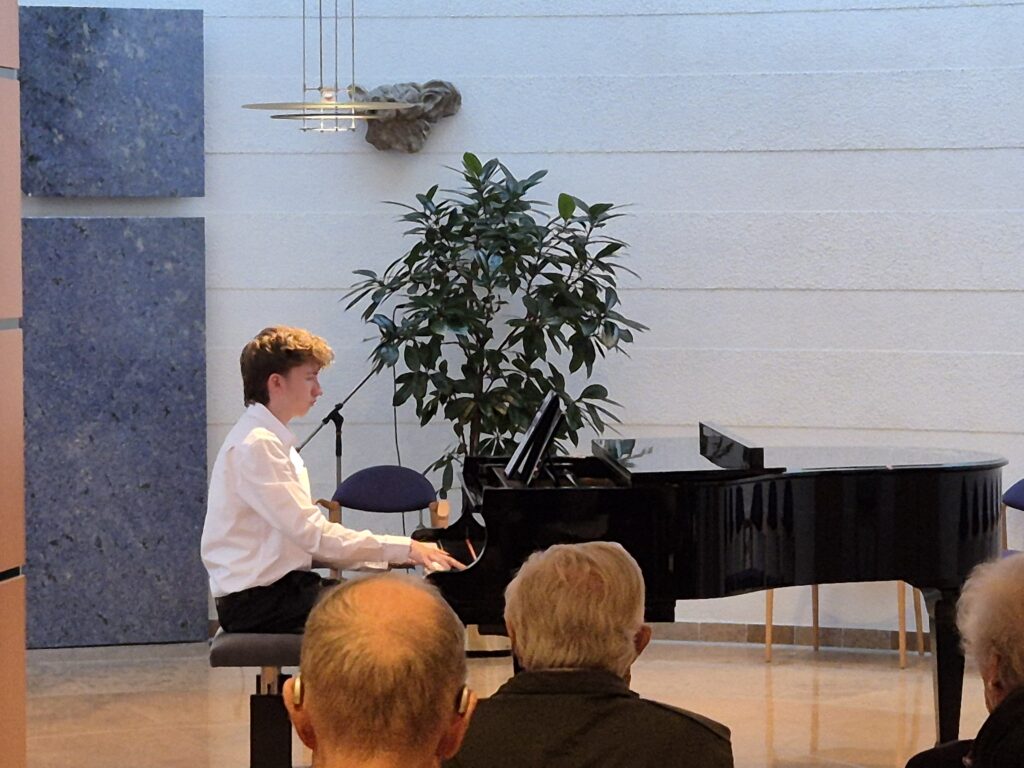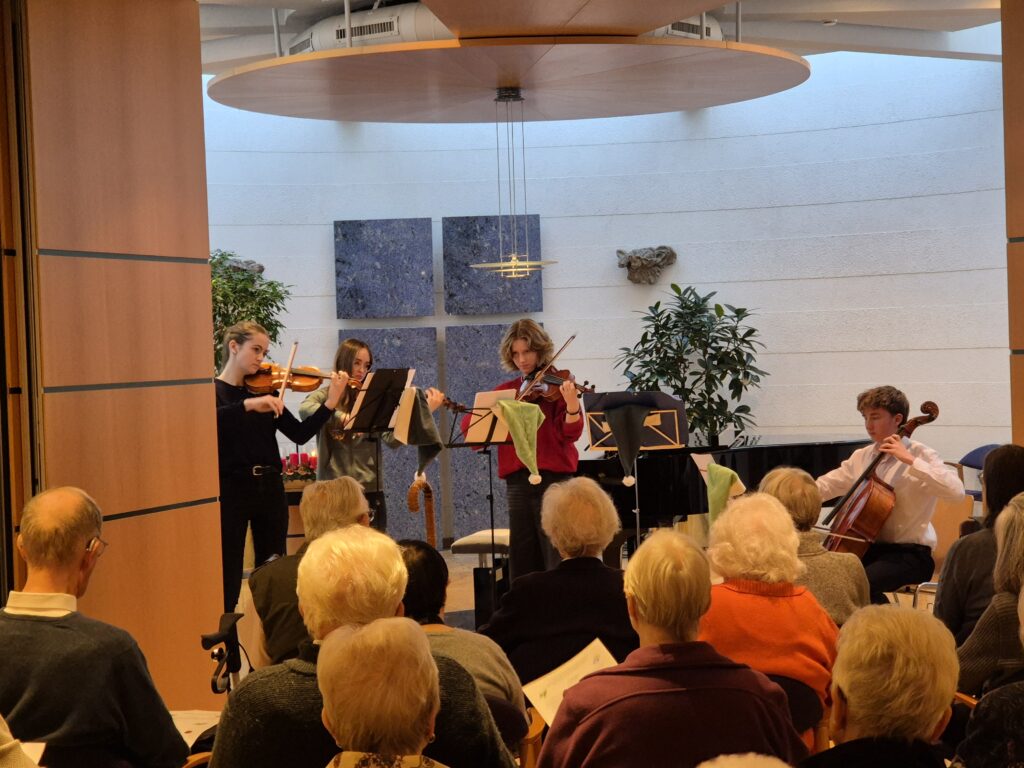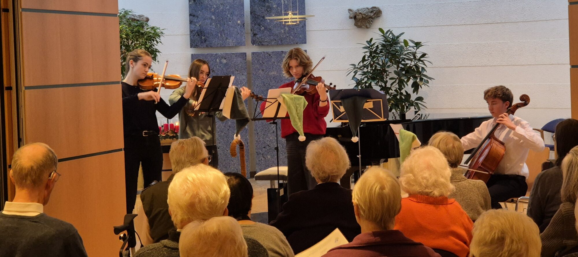 Kurz vor Weihnachten sorgten Noa Sapper, Verena Miller, Karla Sukale und Elias Perkins unserer mit einem stimmungsvollen Auftritt in der Seniorenresidenz Elisa für besondere Momente. Als Streichquartett und am Klavier präsentierten sie eine abwechslungsreiche Auswahl klassischer Werke sowie bekannte Weihnachtslieder. Mit ihrer Musik bereiteten sie den Bewohnerinnen und Bewohnern große Freude und schenkten ihnen eine besinnliche, herzliche Zeit in der Vorweihnachtszeit.