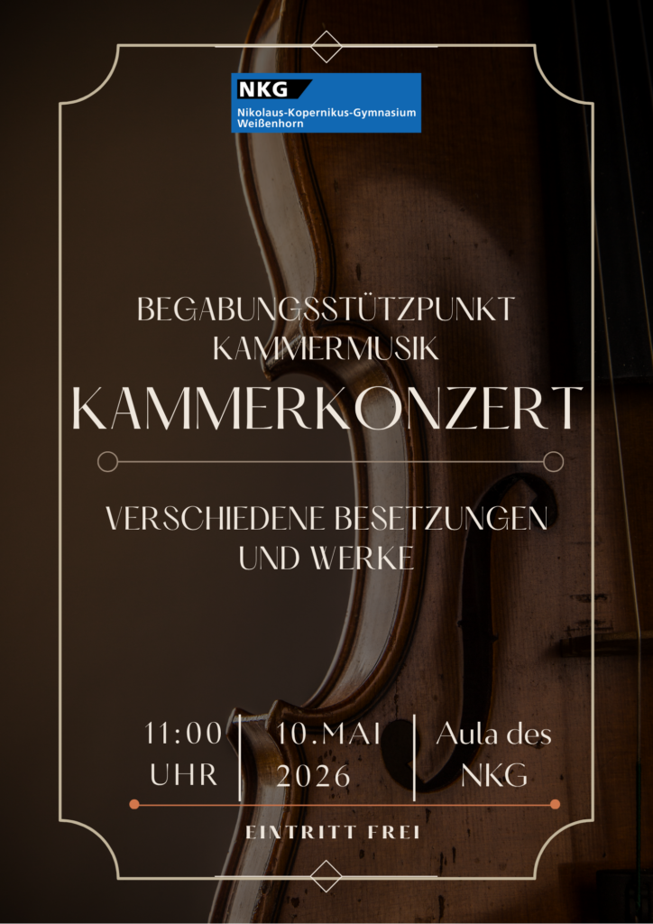 Öffentlich zu hören sind die Ensembles am 11.05.2026 ab 11 Uhr beim Abschlusskonzert in der Aula des NKG und am 13.05.2026 ab 18 Uhr im Ratssaal des Weißenhorner Rathauses im Rahmen der Weißenhorner Kulturnacht.